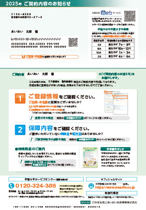 保障内容や、保険金・給付金の請求もれがないかを確認いただくため、年に1回「ご契約内容のお知らせ」をお送りしています。