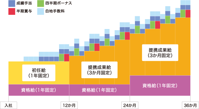 業績に連動した提携成果給(3か月固定)や成績手当、四半期ボーナス・半期賞与白地手数料など、成果に見合った報酬をお支払いします。