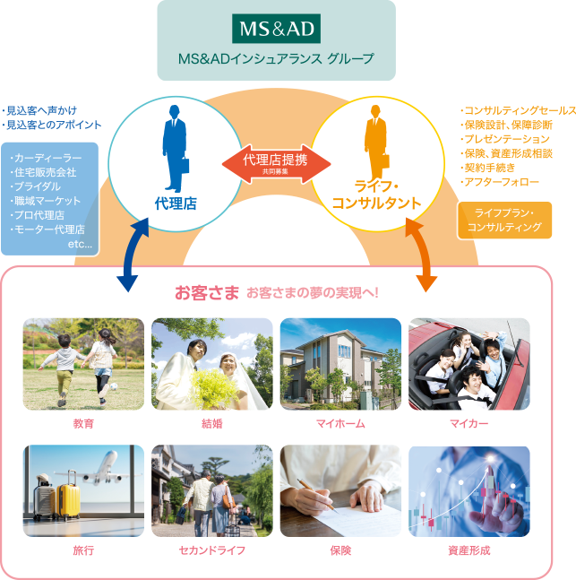 代理店提携とは三井住友海上、あいおいニッセイ同和損保、三井住友海上あいおい生命の代理店が保有する顧客マーケットに対し、ライフ・コンサルタントと代理店がタッグを組んで生命保険の募集活動を行うことです。