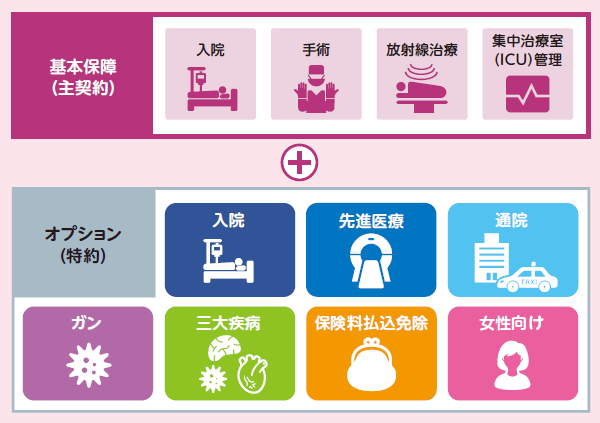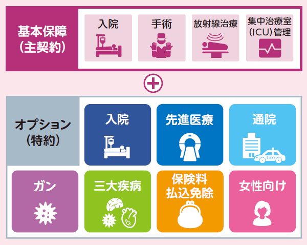 • ・ 基本保障(主契約)に加えて、さまざまなオプション(特約)を追加することで、ニーズにあわせた保障をご準備いただくことができます。