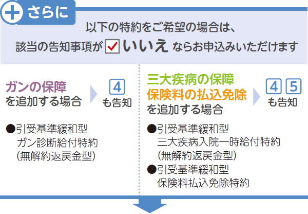 • ・ ガンや三大疾病に備える保障を追加したい場合、追加の告知事項がすべて いいえ なら、お申込みいただけます。
