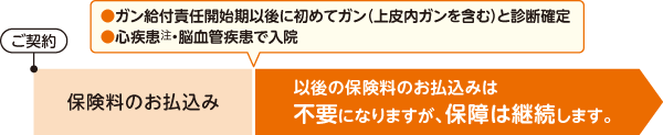 ガン給付責任開始期以後に初めてガン(上皮内ガンを含む)と診断確定されたとき、心疾患注・脳血管疾患で入院されたとき、保障はそのままで以後の保険料のお払込みは不要になります。