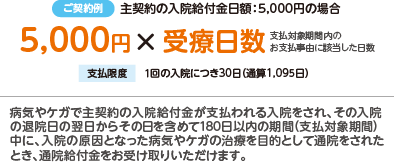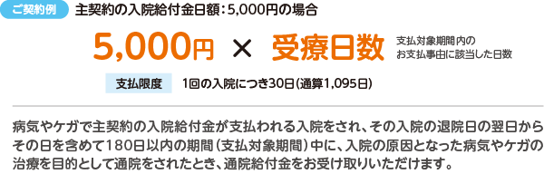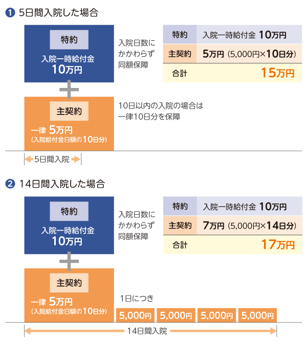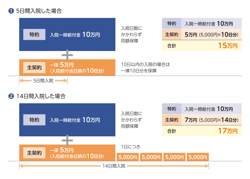 入院給付金日額:5,000円(初期入院10日給付特則あり)、入院一時給付金額:10万円の場合