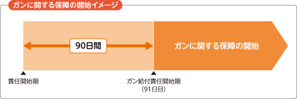 - ※ 責任開始日からその日を含めて90日を経過した日の翌日(91日目)をガン給付責任開始日としてガン治療通院給付特約(無解約返戻金型)のガンに関する保障を開始します。