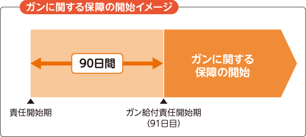 ガン給付責任開始期とは、ガンに関する保障を開始する時のことです。ガン給付責任開始期は、責任開始日注からその日を含めて90日を経過した日の翌日(91日目)からとなり、下記の特約が対象となります。