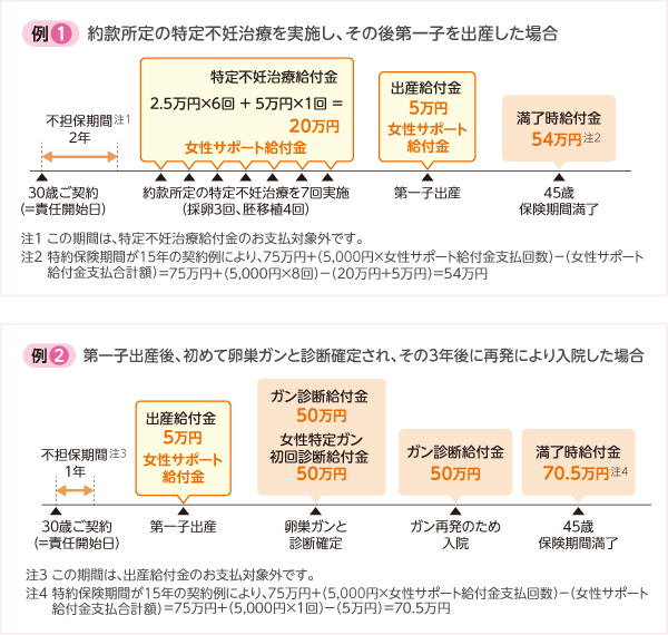 約款所定の出産・特定不妊治療に該当したとき、ガン(上皮内ガンを含む)と診断確定された ときに一時金をお受け取りいただけます。特約保険期間は、10年・15年・20年から選択いただけます。