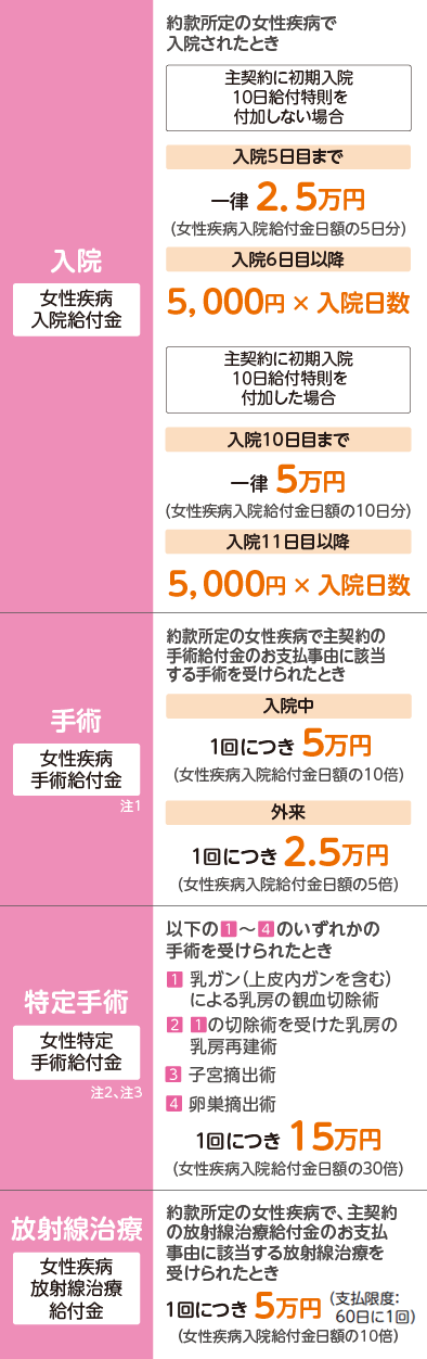 - 注1 同一の日に女性疾病手術給付金のお支払事由に該当する手術と女性特定手術給付金のお支払事由に該当する手術を受けられた場合で、女性特定手術給付金をお支払いするときは、その日に受けられた手術に対しては女性疾病手術給付金はお支払いできません。