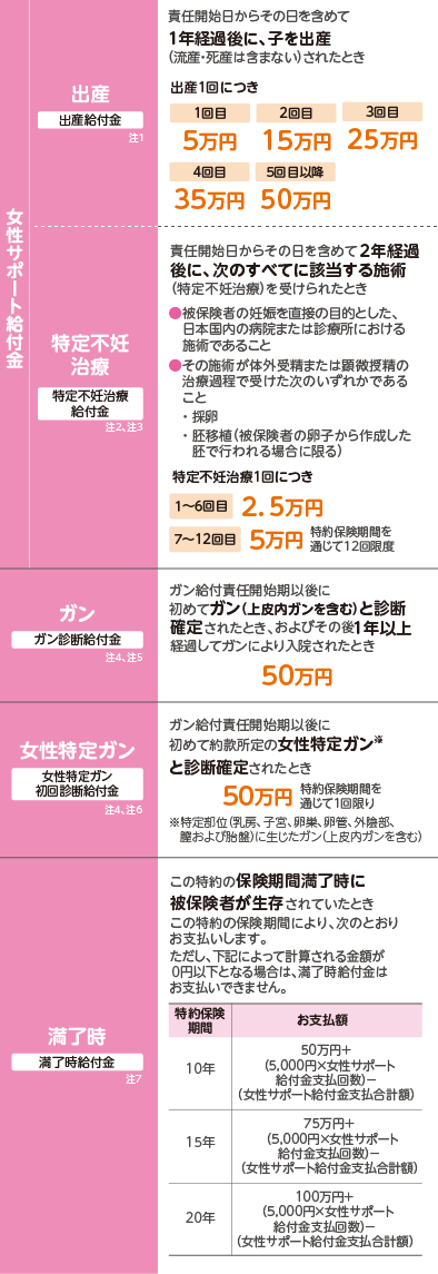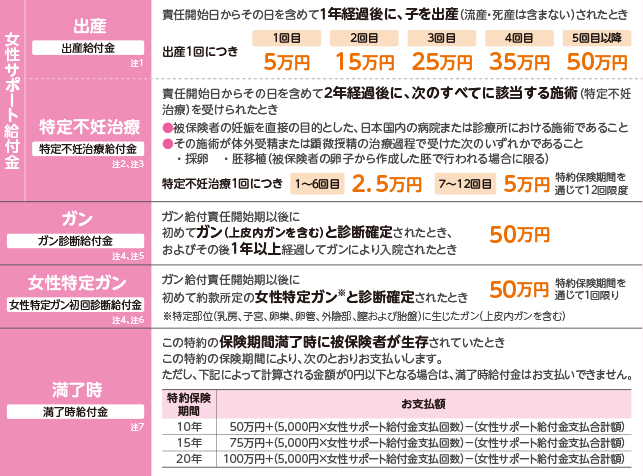 - ※ 女性サポート給付金付ガン診断給付特約からお受け取りいただける給付金のみ記載しています。