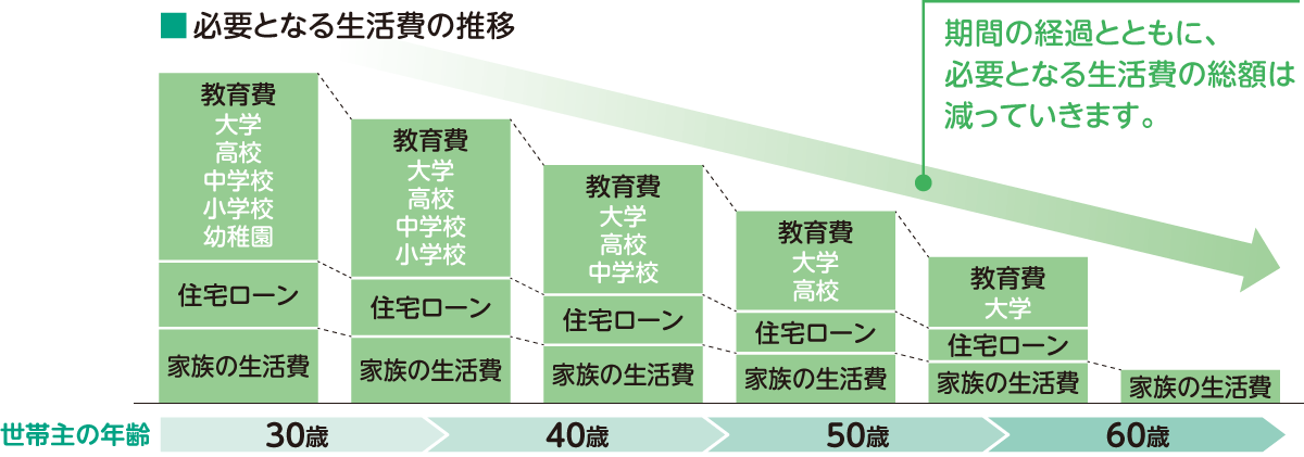 一般的に、必要となる生活費の総額は期間の経過とともに減っていきます。この保険は、期間の経過とともに年金受取総額が減少していきますので、合理的に保障を確保できます。
