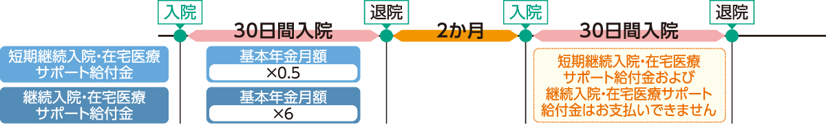 - ※継続入院・在宅医療サポート給付金の支払事由に該当した日からその5か月後の月単位の応当日までの間に、新たな入院または在宅医療を開始し短期継続入院・在宅医療サポート給付金または継続入院・在宅医療サポート給付金の支払事由に該当した場合、短期継続入院・在宅医療サポート給付金または継続入院・在宅医療サポート給付金をお支払いできません。