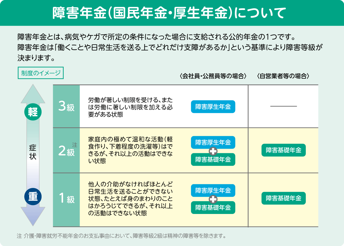の部分は介護・障害就労不能年金のお支払事由に該当します(障害年金における障害等級2級は精神の障害等を除く)。