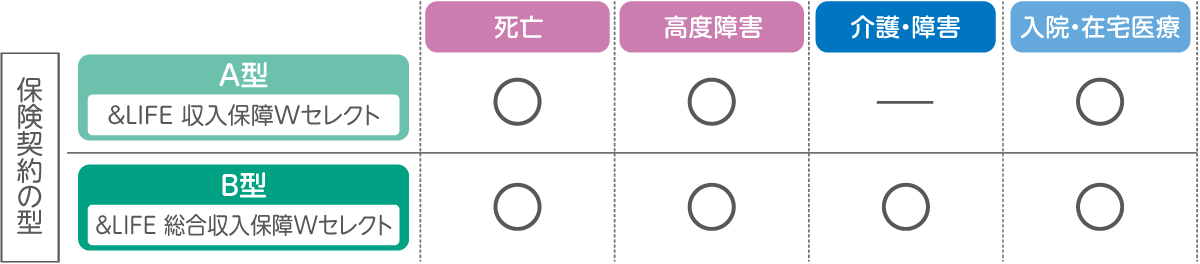 ※「&LIFE 収入保障Wセレクト」、「&LIFE 総合収入保障Wセレクト」は「死亡・介護障害選択型収入保障保険(無解約返戻金型)無配当」の販売名称です。