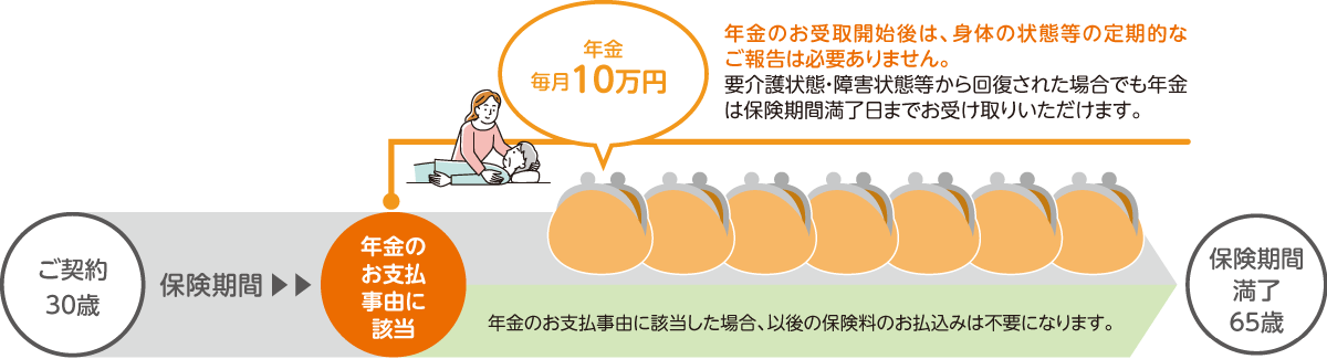 • 保険契約の型に応じて、死亡されたとき、要介護状態・障害状態等になられたときの収入減少に、保険期間満了まで毎月の年金で備えることができます。