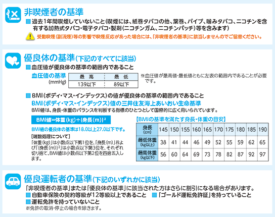 被保険者の健康状態その他が三井住友海上あいおい生命所定の基準を満たす場合、申込時にご契約者からお申し出いただくことにより、健康状態、喫煙歴等の状況、自動車等の運転履歴に応じて保険料を割り引きます。