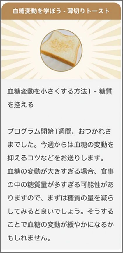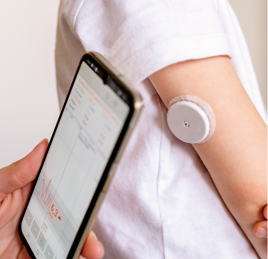 センサー(持続型血糖測定器)を上腕に装着し専用アプリでセンサーとスマホを接続。食事や運動の記録もご自身でアプリに入力していただきます。