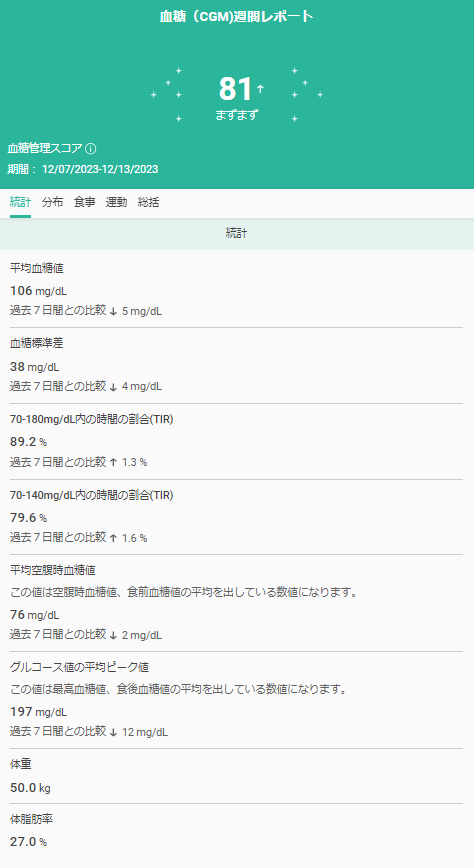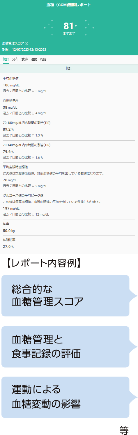 測定結果を集計し、食事や運動による血糖値の変動や総合的な血糖管理評価などを