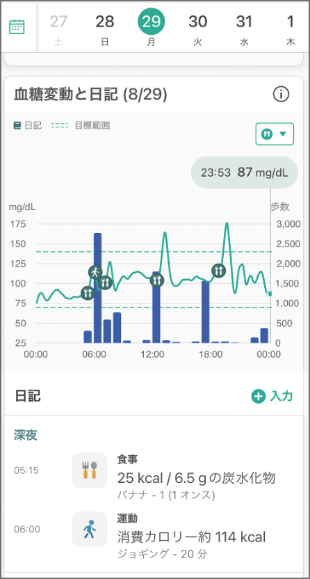 間質液中のグルコース濃度を血糖値に変換するため、血液の測定とは差異がある場合があります。なお、本センサーは医療機関でも採用されており、血糖値の変動を測定する観点では問題ありません。