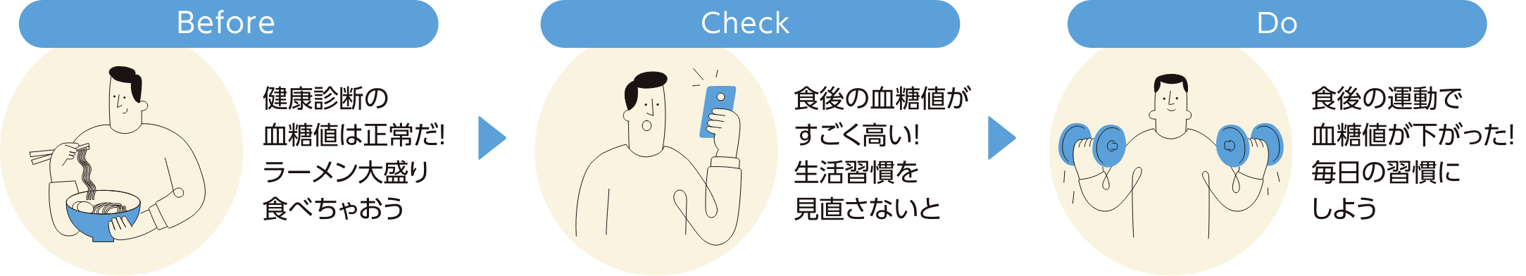 持続型血糖測定器として、手軽な上腕装着タイプを採用。健康診断などで知ることのできない