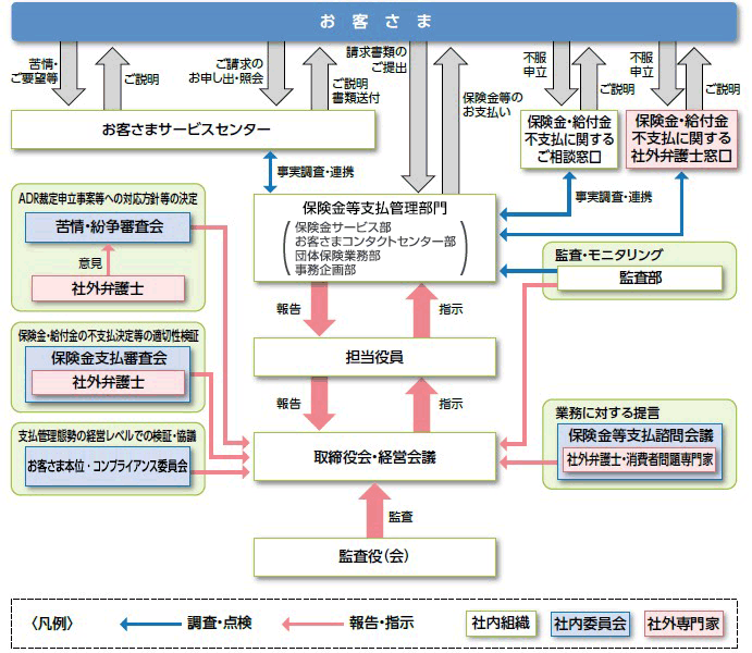 また、保険金等支払業務の正確性・客観性・透明性を確保する観点から、保険金等支払業務の適切性を社内および社外から監視・検証する体制を整備するとともに、保険金等の支払に関する苦情を漏れなく把握して、お客さまの声を業務の改善に反映させる取組みを行っています。