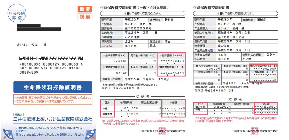 | (旧)あいおい生命、(旧)三井住友海上きらめき生命、三井住友海上あいおい生命、全てのご契約を名寄せしてお送りさせていただきます。(ただし、ご契約ごとの保険料のお払込み状況により、名寄せされない場合があります。ご了承ください。) |